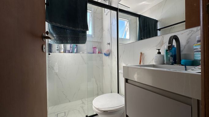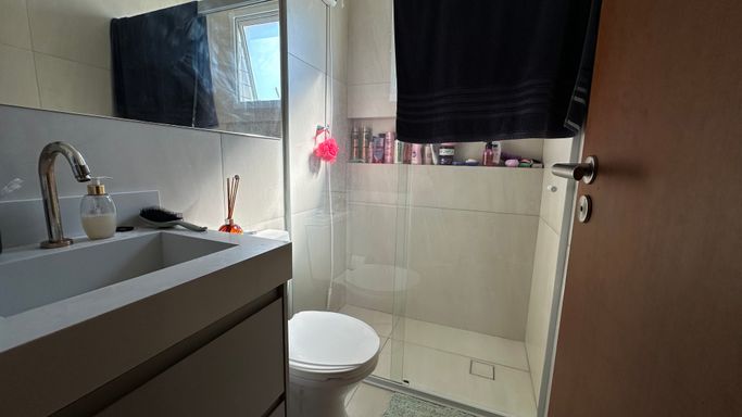 * Banheiros equipados com gabinete e box de vidro.