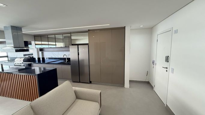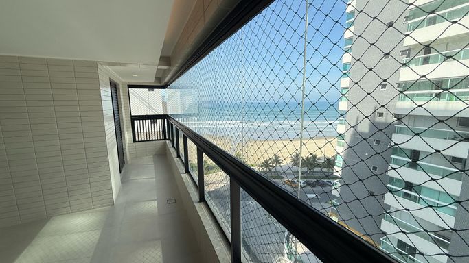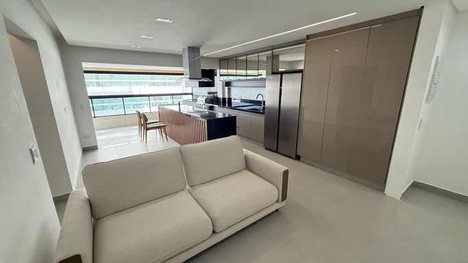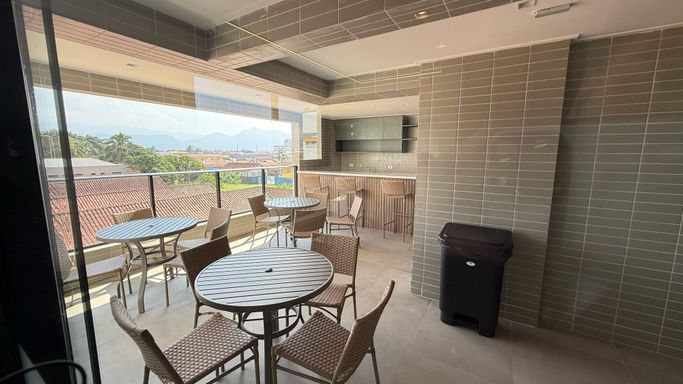 Um dos grandes destaques é a varanda gourmet integrada com a sala, já envidraçada e com vista para o mar, criando um ambiente acolhedor e perfeito para momentos de lazer e descontração. O espaço é ideal tanto para receber amigos quanto para relaxar com a brisa do oceano.