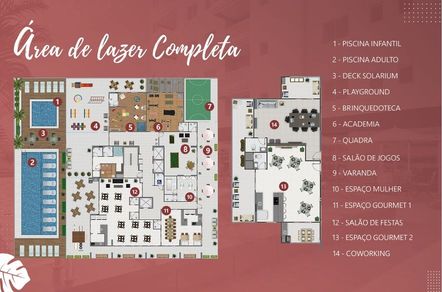 O prédio oferece piscina infantil e adulto, deck solarium, playground, brinquedoteca, academia, quadra polisportiva, salão de jogos, varanda, espaço mulher, 2 espaços gourmets, salão de festas e coworking.